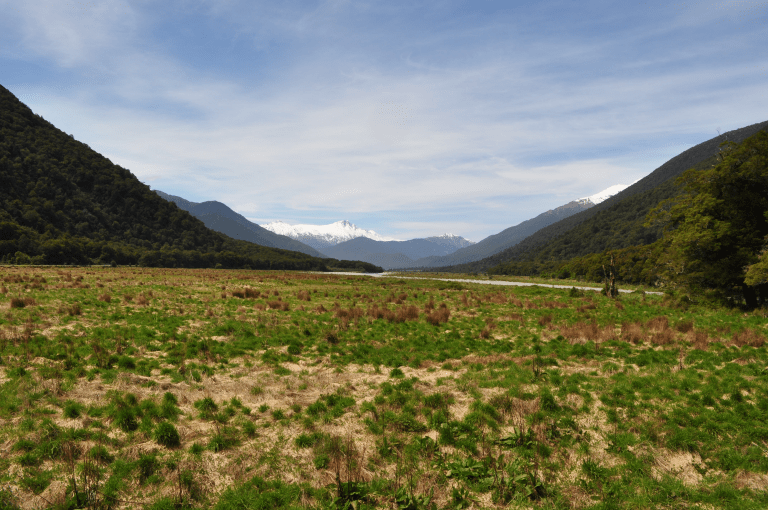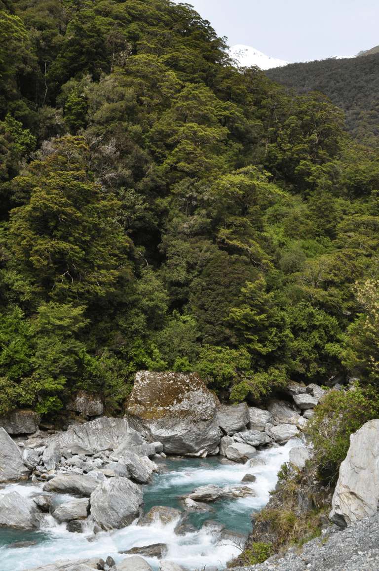 De Franz Joseph glacier jusqu’à Haast pass, on longe les montagnes avant de retrouver le cours d’une rivière bleue azure. Le paysage est surréel: les sommets enneigés côtoient les flancs abruptes dénudés d’arbres avant de devenir forêt sub-tropicale.